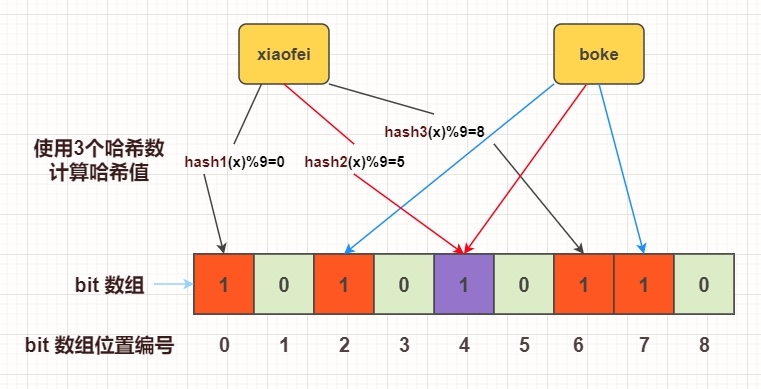 bit 数组长度是9,散列函数个数是3,存入 xiaofei和boke这两个元素。这两个元素经过三次哈希函数生成3个哈希值,并映射到bit数组的不同的位置,并置为1。查询的时候进来一个xiaofei,计算它三次哈希值并找到对应的bit数组位置编号,看看是否为1,若为1表示存在,否则不存在。