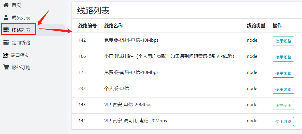 3、点击左侧菜单栏 线路列表,即可选择VIP线路。