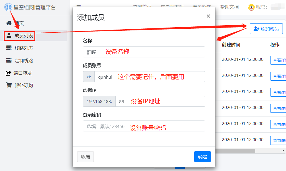 成员账号:就是软件登录账号,如图所示格式为: xi:qunhui
