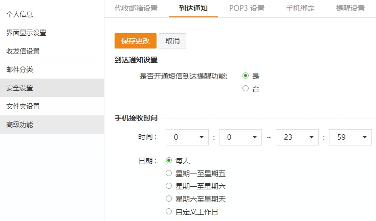 邮箱 - 设置(右下角齿轮) - 高级功能 - 到达通知