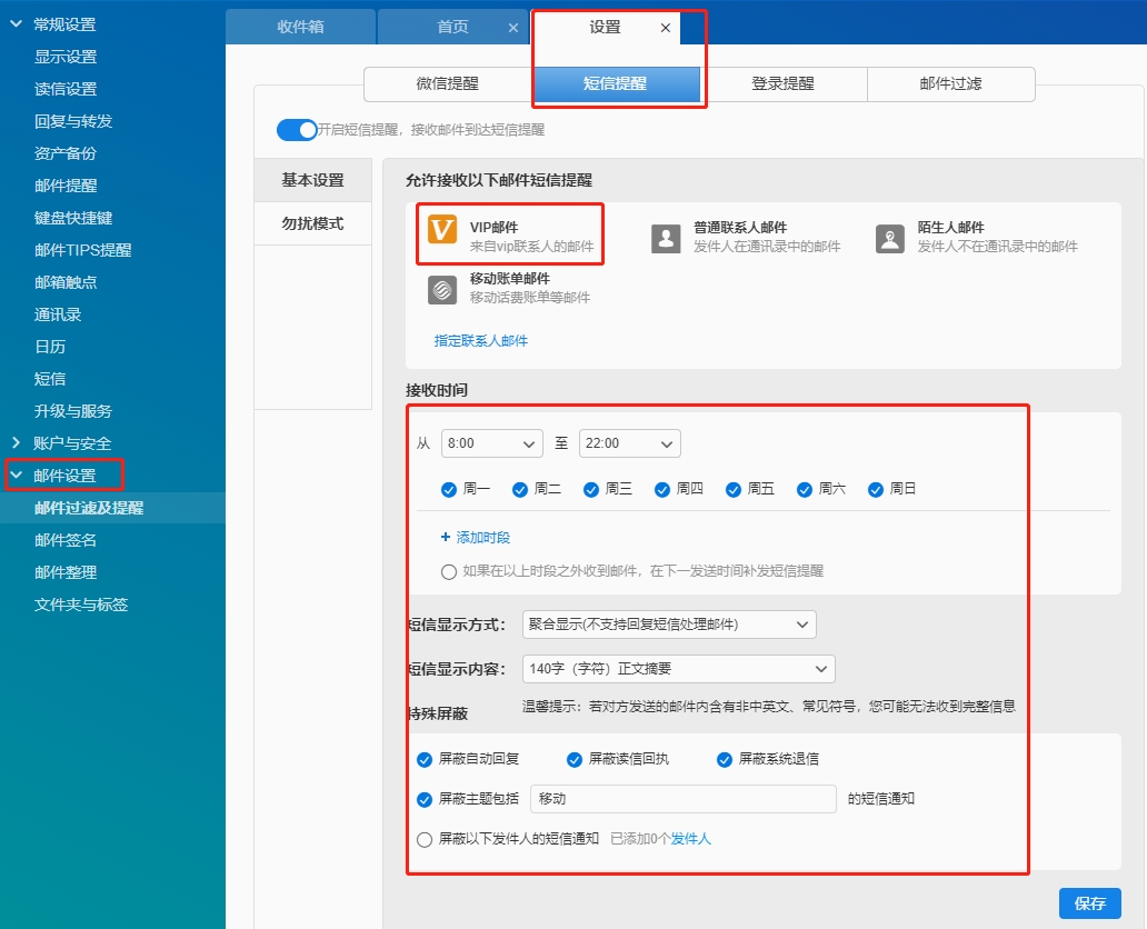 短信提醒:可开启关闭,设置通知时间段,可指定VIP用户等