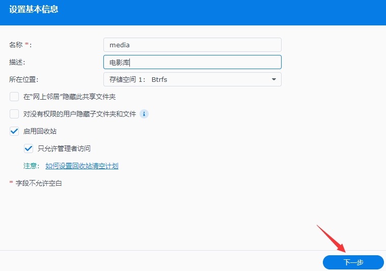 名称写一个非中文的名字,我这里要建立一个文件夹,专门用来做做影视库,所以写的是media,下一步;