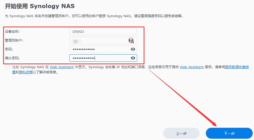 2、根据实际需要设置设备名称(必须以英文字母开头)、管理员账号(可以使用中文)、管理员密码(要求:大写字母+小写字母+数字的组合,长度8位或以上),下一步;