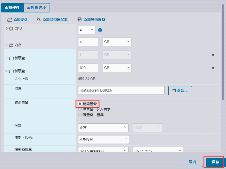 11、根据实际需要设置虚拟机硬盘的大小,硬盘置备设置为精简置备,保存;