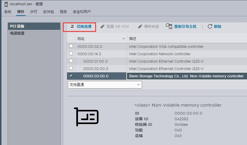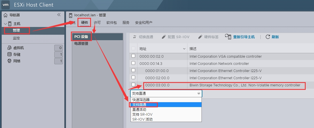 1、返回Esxi界面,点击管理—>硬件—>找到和图片相符的—>选择直通,然后重启Esxi