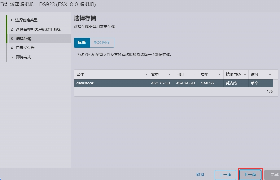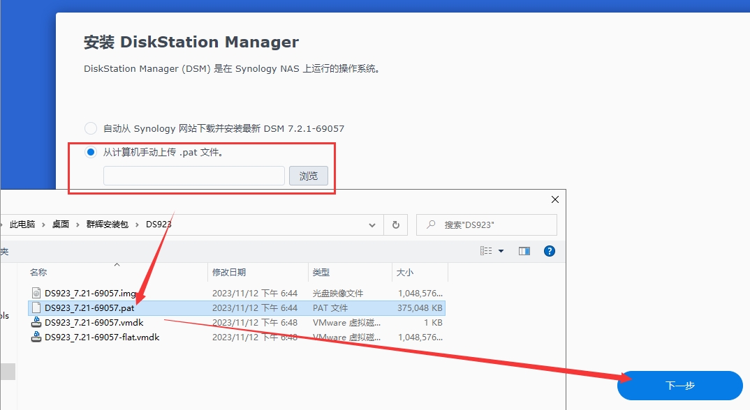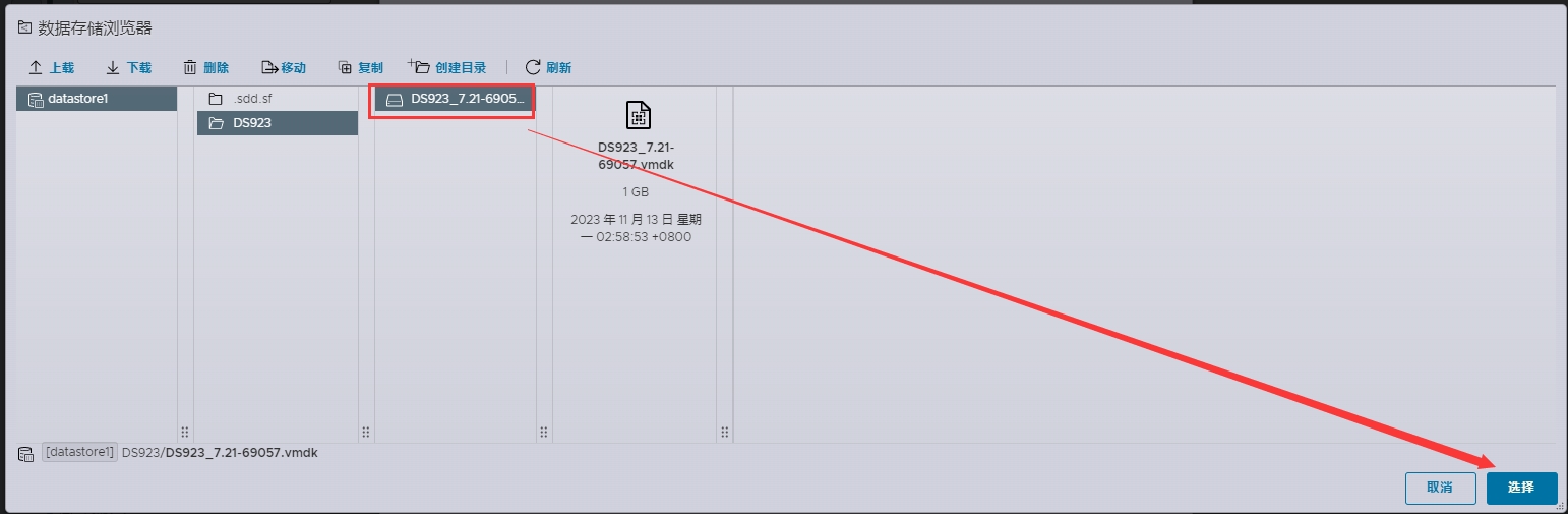 9、当DS923_7.2-64570.vmdk和DS923_7.2-64570-flat.vmdk两个文件都上传完成后,这里就会显示出DS923_7.2-64570.vmdk(此时DS923_7.2-64570-flat.vmdk会自动处于隐藏状态,属于正常现象),点DS923_7.2-64570.vmdk这个文件,再点选择;