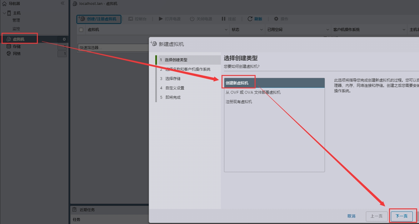 1、登录ESXI后台,点虚拟机—>创建新虚拟机;