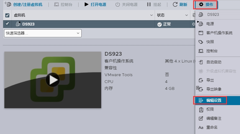 6、找到刚刚创建的群辉,点击操作,编辑设置;