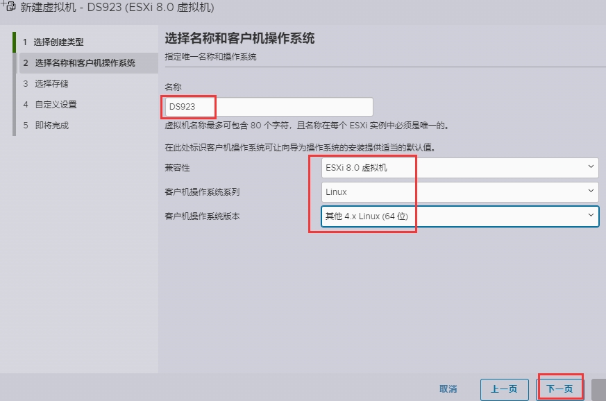 2、虚拟机的名称写一下,兼容性使用Esxi 8.0 虚拟机,客户机操作系统系列选择Linux,客户机操作系统版本选择其他4.X Linux (64位)