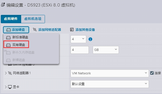7、添加硬盘—>现有硬盘;