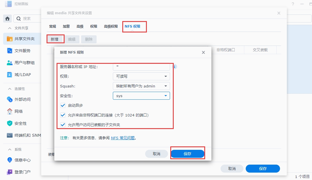 给刚刚创建的文件夹添加 NFS规则,规则配置如下: