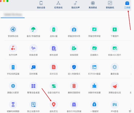 3、电脑上打开爱思助手,打开工具箱,选择虚拟定位