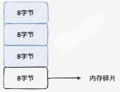 操作系统为你分配了 32 字节的连续内存空间,而你存储数据实际只需要使用 24 字节内存空间,那这多余出来的 8 字节内存空间如果后续没办法再被分配存储其他数据的话,就可以被称为内存碎片